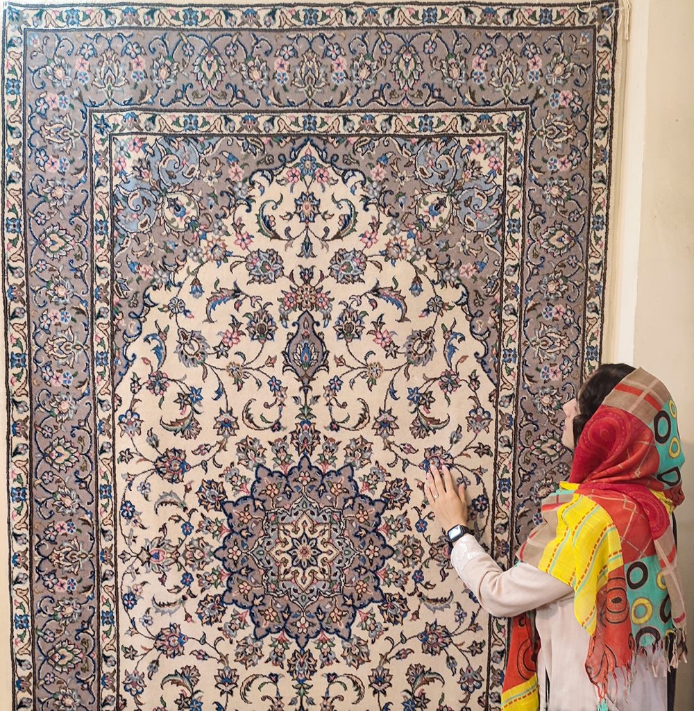 در مقابل یک نمونه قالی دستباف طرح نایین اصفهان را مشاهده می کنید. قالی نایین به خاطر نقشهای پیچیدهشان مشهور هستند که اغلب نقوش گل و مدالهای مرکزی با الهام از میراث فرهنگی و هنری است. این نوع فرش نه تنها از نظر بصری خیرهکننده هستند، بلکه دوام قابلتوجهی نیز دارند. این فرشها با تراکم گره بالایی که دارند از دیگر فرشها متمایز میشوند که میتواند بین ۳۰۰ تا ۷۰۰ گره در هر اینچ مربع باشد. در واقع این ویژگی فرش نایین باعث میشود تا فوقالعاده مجلل و پر از جزئیات باشد. ویژگی دیگری که برای فرش نایین میتوان ذکر کرد، استفاده از رنگهای طبیعی و سنتی است.